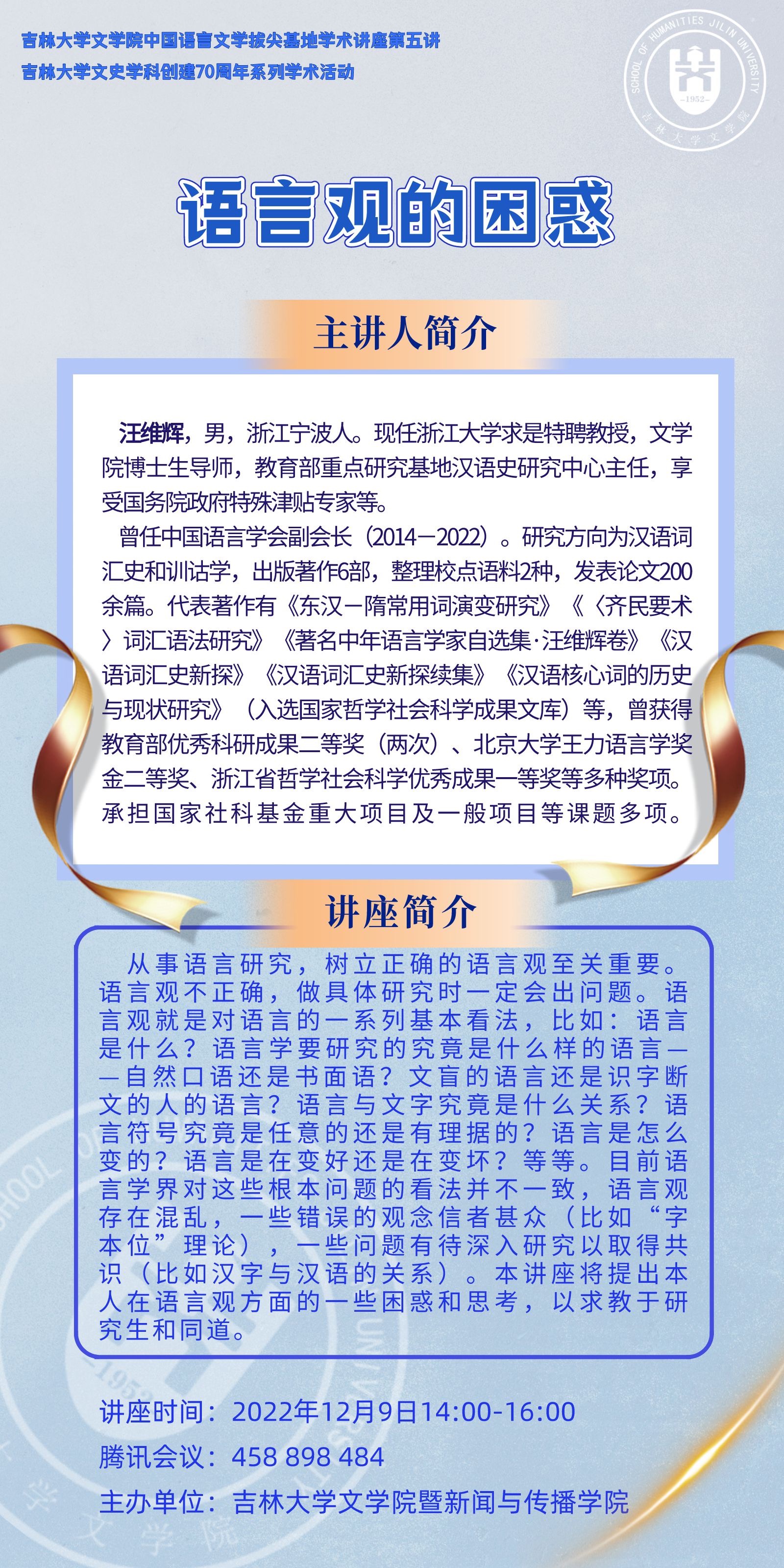 主讲人简介:汪维辉,男,浙江宁波人。现任浙江大学求是特聘教授,开云电子(中国)官方网站_开云电子(中国)官方网站博士生导师,教育部重点研究基地汉语史研究中心主任,享受国务院政府特殊津贴专家。曾任中国语言学会副会长(2014-2022)。研究方向为汉语词汇史和训诂学,出版著作6部,整理校点语料2种,发表论文200余篇。代表著作有《东汉-隋常用词演变研究》《〈齐民要术〉词汇语法研究》《著名中年语言学家自选集·汪维辉卷》《汉语词汇史新探》《汉语词汇史新探续集》《汉语核心词的历史与现状研究》(入选国家哲学社会科学成果文库)等,曾获得教育部优秀科研成果二等奖(两次)、北京大学王力语言学奖金二等奖、浙江省哲学社会科学优秀成果一等奖等多种奖项。承担国家社科基金重大项目及一般项目等课题多项。