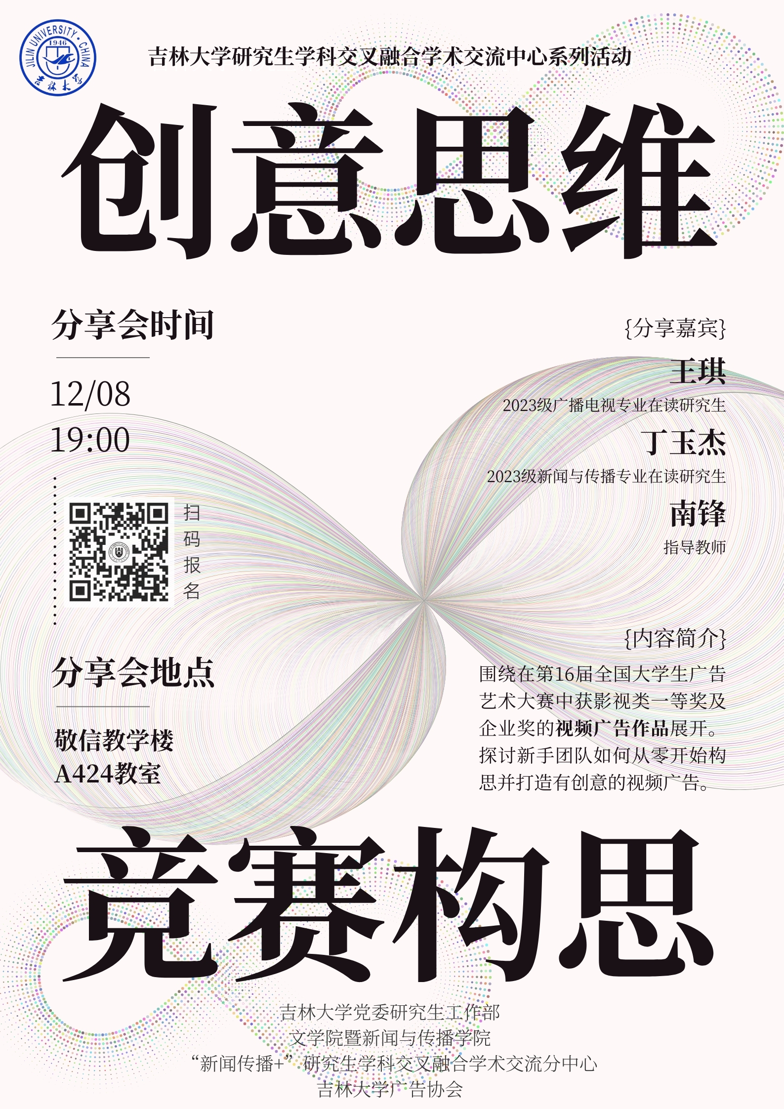 内容简介:本次分享将围绕在第16届全国大学生广告艺术大赛中荣获影视类一等奖及企业奖的视频广告作品展开。针对作为创作新手的主创团队,分享如何从零开始构思并形成具有创意的视频广告作品,并深入探讨: