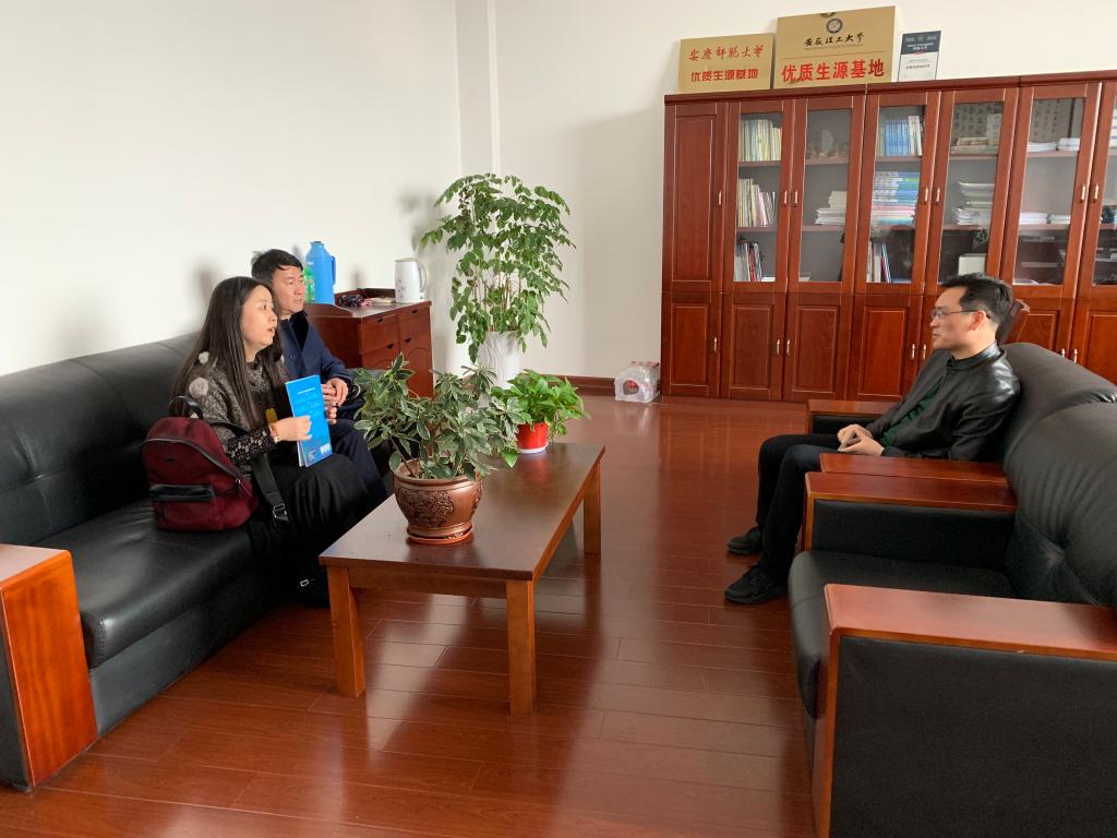 3月28日下午,田鹏、徐萍、石聪老师一行人来到安徽师范附属中学,与教导主任章志学见面交流。章主任提到去年学校有两位考生考入吉林大学,考生们对吉林大学有一定的认可度,但对北方学校依然存在地域上的误解,比如天气、交通等问题,石聪老师表示今后会加强对这些方面的宣传,尽可能解除南方考生对北方学校的认知误区。章主任对我校选择在安徽师范附属中学建立优质生源基地表示衷心地感谢,希望此次合作能加深双方的了解,共同为国家培养更多更好的人才。