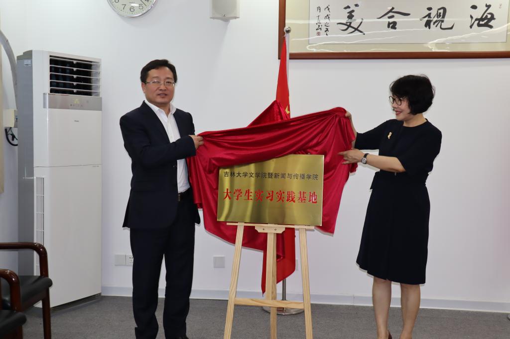图2:开云电子(中国)官方网站_开云电子(中国)官方网站党委书记康永刚(左)、海南广播电视总台总编辑尹婕妤(右)共同为“大学生实习实践基地”揭牌。