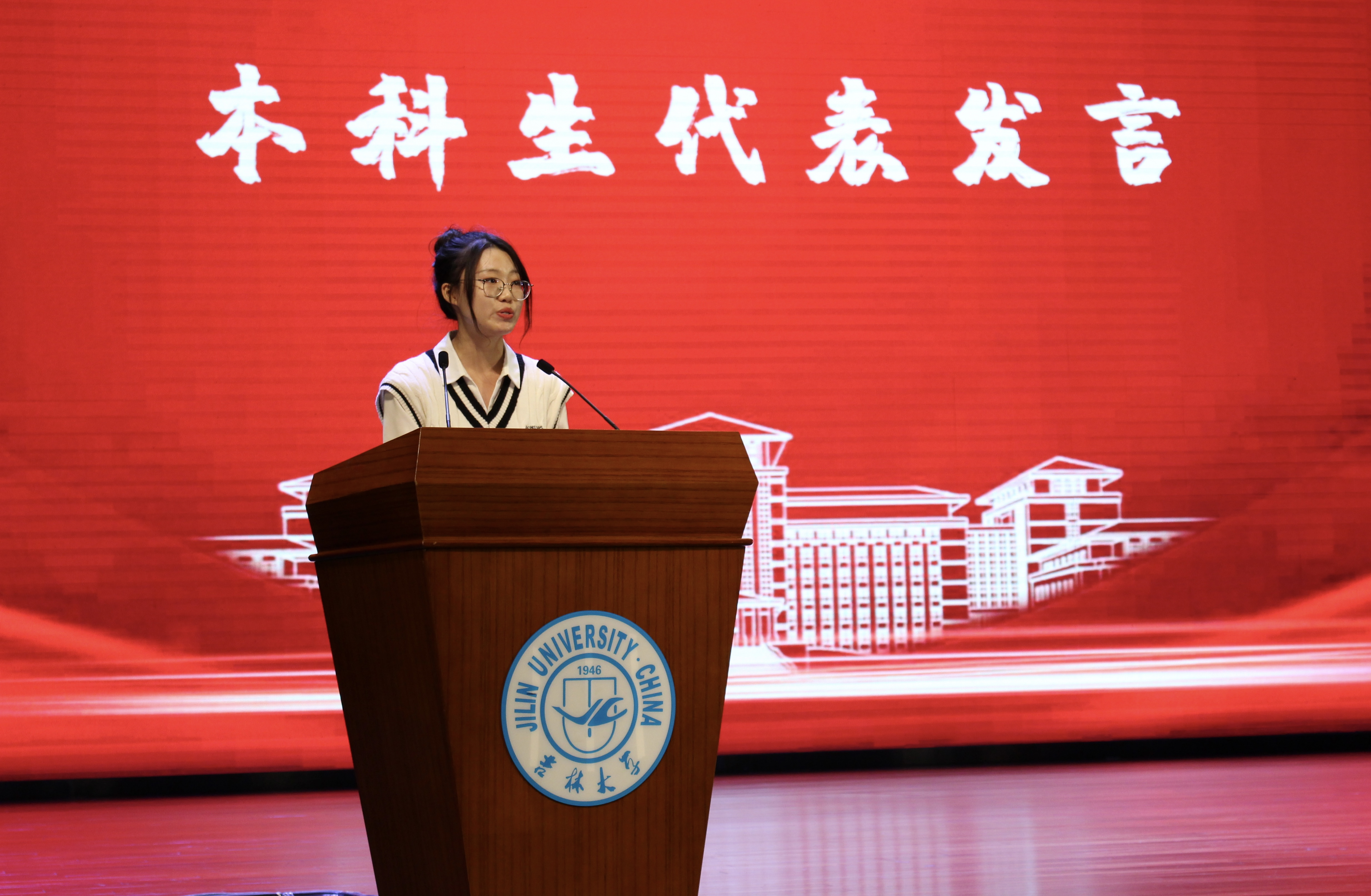 会议第四项,本科新生代表,新闻与传播学院新闻传播学类韩昕桐同学发言。她表示,要牢记吉大的光辉历史,赓续吉大精神,努力学习专业知识,与党和国家同呼吸、共命运,与中华民族伟大复兴齐步伐。