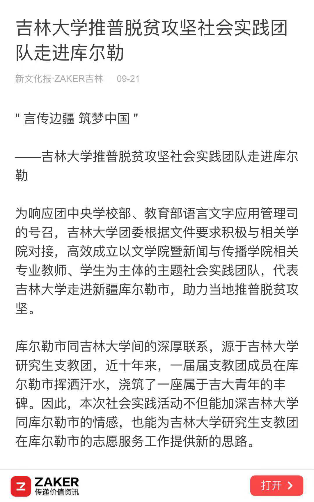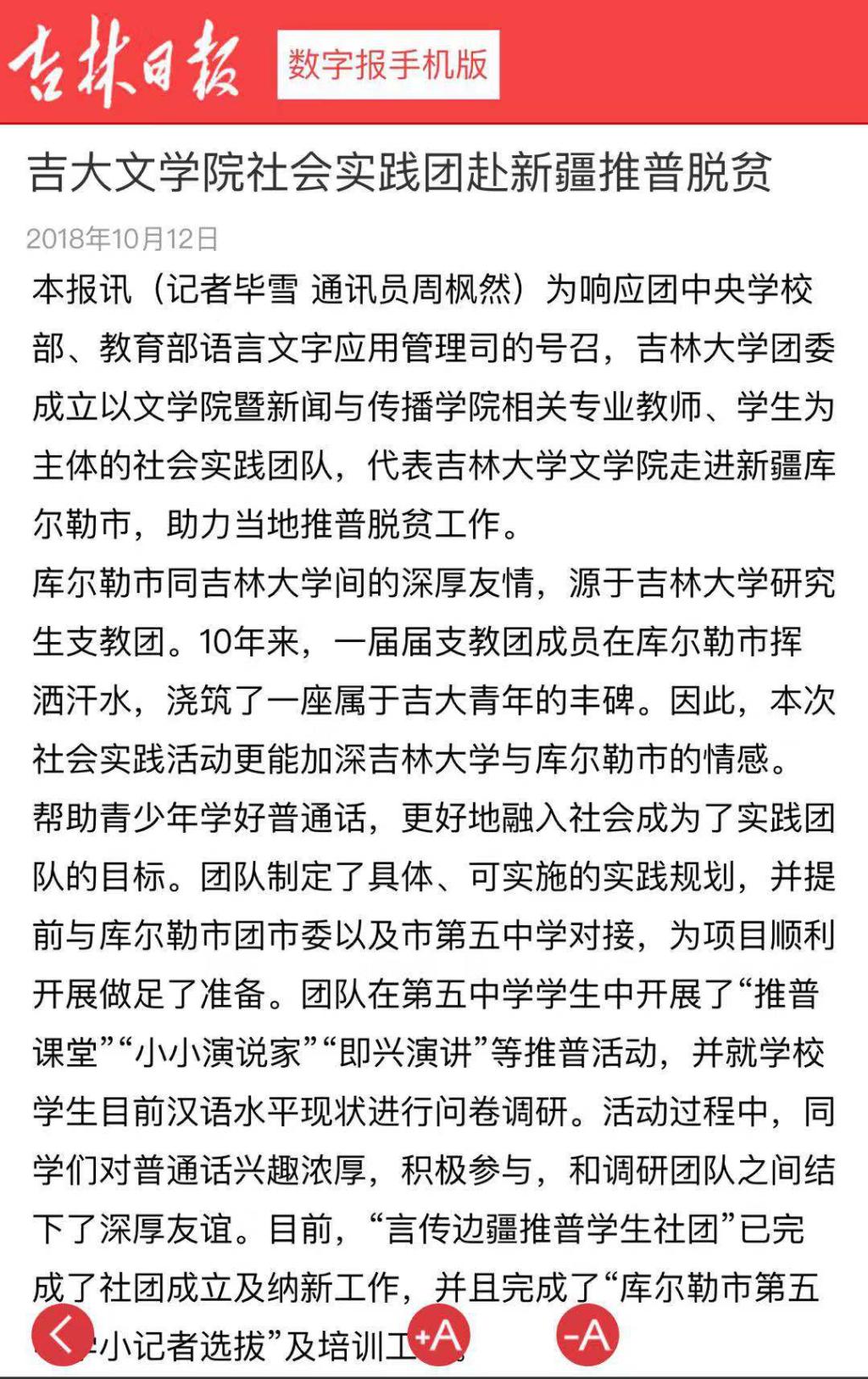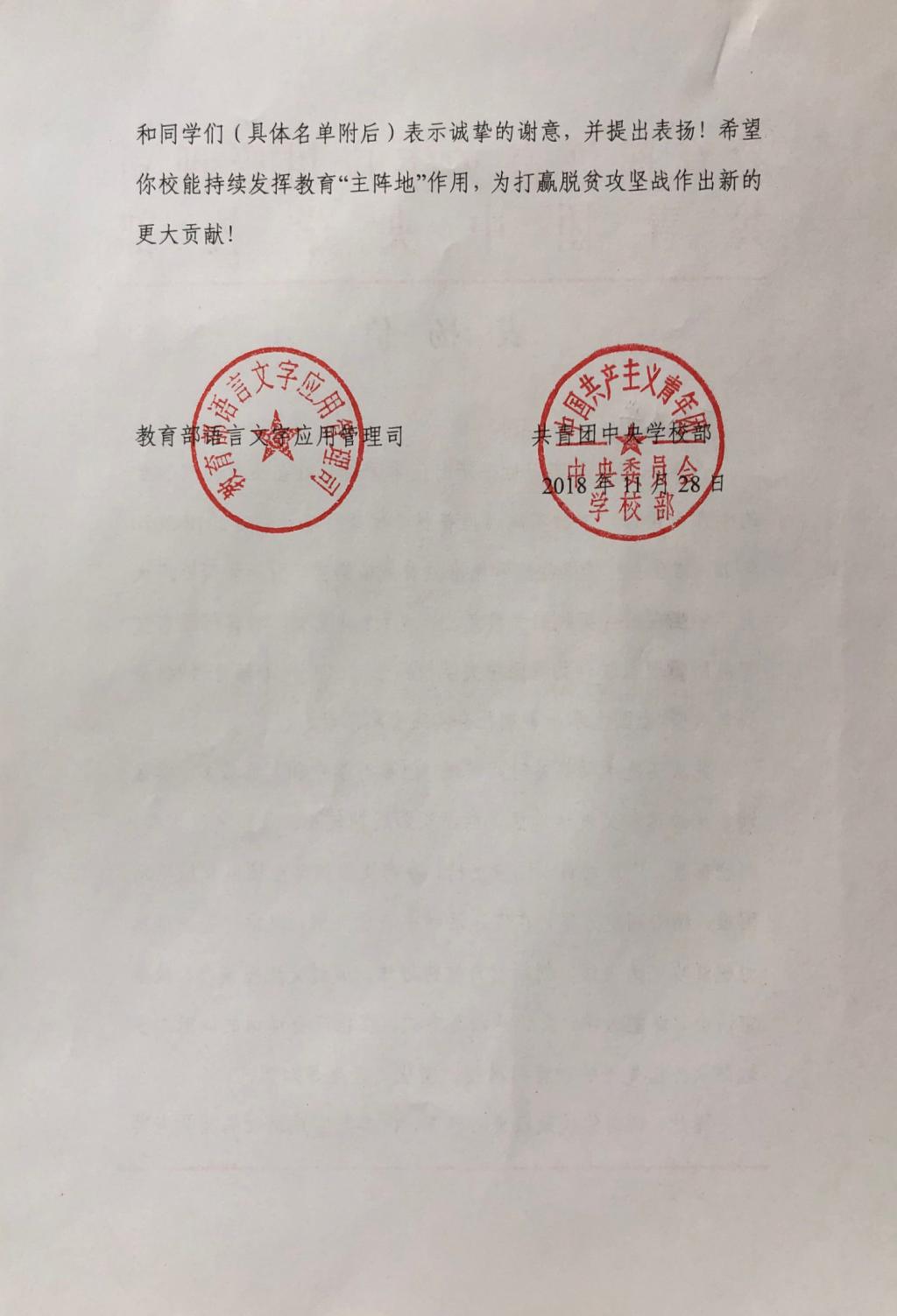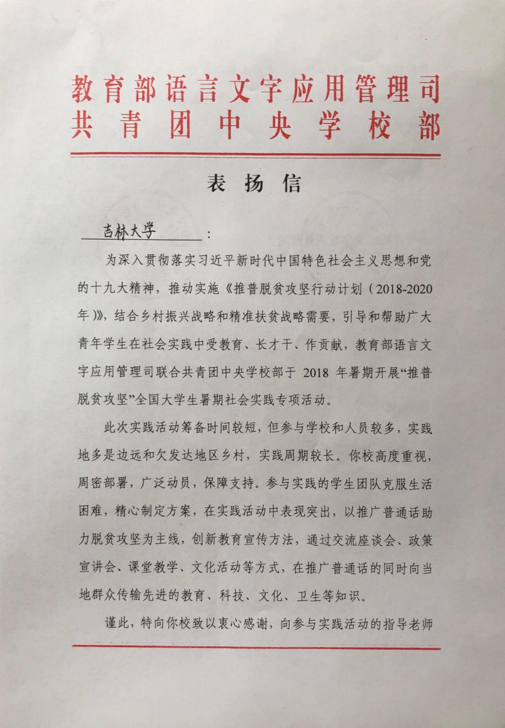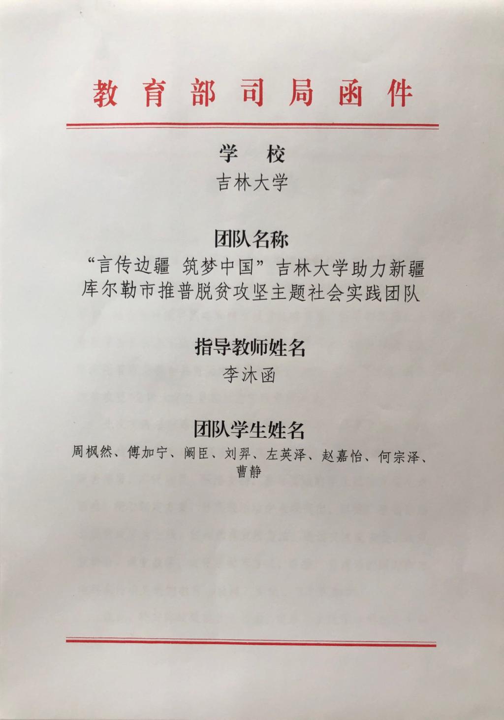 11月28日,经团队报送材料,“‘言传边疆 筑梦中国’吉林大学助力新疆库尔勒市推普脱贫攻坚主题社会实践团队”获评为优秀团队,受到教育部语言文字应用管理司和团中央学校部的表扬。开云电子(中国)官方网站_开云电子(中国)官方网站团委定将以此为激励,继续在引导青年、志愿服务等方面发挥示范作用,成为帮助青年学生成长的优秀平台。
