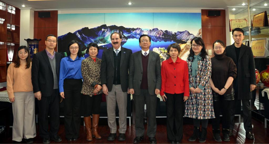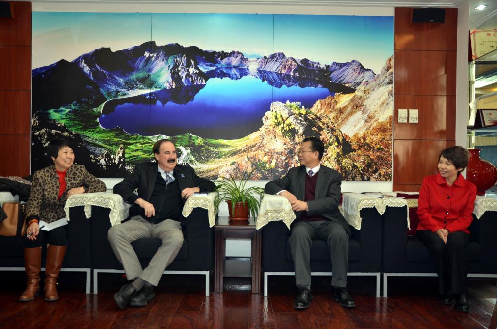 图1:肯塔基大学文理学院院长马克教授(左二)、孔子学院院长修华静教授(左一)与吉林大学新闻与传播学院院长徐正考教授(右二)、副院长孔朝蓬教授(右一)会谈。