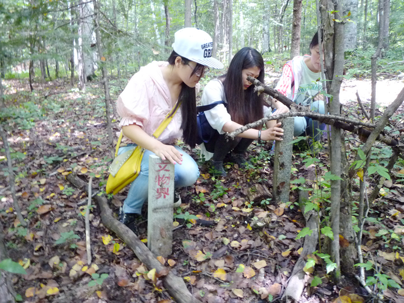 第六站,靖宇县那尔轰镇暨“那尔轰会师”纪念地。“那尔轰会师”是东北抗日斗争史上的一次重大历史事件和重要转折点,具有十分深远的历史意义。1935年8月底,东北人民革命军第二军政治部主任李学忠率第二团两个连150人与第一军第二师部队在南满抗日游击根据地靖宇县那尔轰胜利会师,史称“那尔轰会师”。为了纪念那尔轰会师,靖宇县政府曾于1965年5月,在会师地址竖立胜利纪念碑,1981年4月20日吉林省人民政府公布那尔轰遗址为吉林省重点文物保护单位,重新建立纪念碑。8月9日,调研团队开始对那尔轰会师地遗址进行调研踏查,经过调研,我们得知那尔轰会师地不在那尔轰镇,而是在景山镇的崇礼村。在终于到达会师地纪念碑前之际,队员们仔细观察发现,因为多年无人祭扫,纪念碑上已经长满了绿色苔藓,与周边的绿树浑然一体,很难发现。在会师地纪念碑前,我们拜读了碑文,了解那段抗联历史,缅怀抗联先烈们的英雄事迹,同时,对纪念碑周边环境进行了考察。队员们还动手把已经倾倒了的当年由吉林省人民政府为那尔轰会师地设立的写有“文物界”的小石碑,扶起立稳,用手把有字的碑面擦拭干净露出“文物界”的碑文(图16—图19)。找到了会师地纪念碑,我们的那尔轰会师遗址调研踏查活动终于得以圆满告成。带着发现的喜悦,带着完成调研的轻松,调研团队队员们心情愉快地下山了。