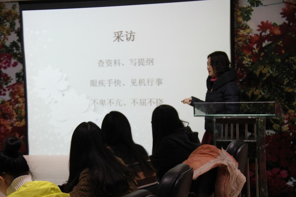 (主讲王博潇柔在为同学们讲解新闻采访时的注意事项 摄像:张汇川)