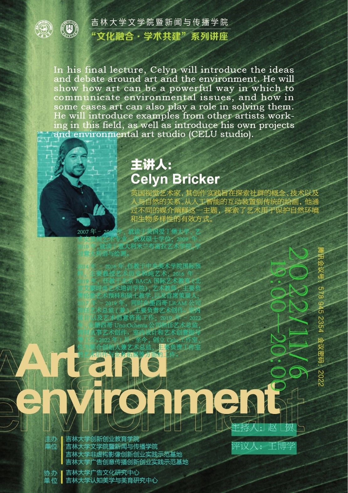 11月6日晚上19:00,由吉林大学创新创业教育学院、开云电子(中国)官方网站_开云电子(中国)官方网站暨新闻与传播学院、吉林大学非虚构影像创新创业实践示范基地、吉林大学广告创意传播创新创业实践示范基地主办,吉林大学广告文化研究中心和吉林大学认知美学与美育研究中心协办了主题为“艺术与生态”的“文化融合·学术共建”国际学术讲座。本次讲座以线上形式进行,由传播系国际传播教研室主任赵贺副教授主持,吉林大学广告文化研究中心副主任王博学老师评议。相关专业老师、在读本科生及硕士研究生共90余人参与了此次活动。本期讲座仍由英国视觉艺术家Celyn Bricker主讲。