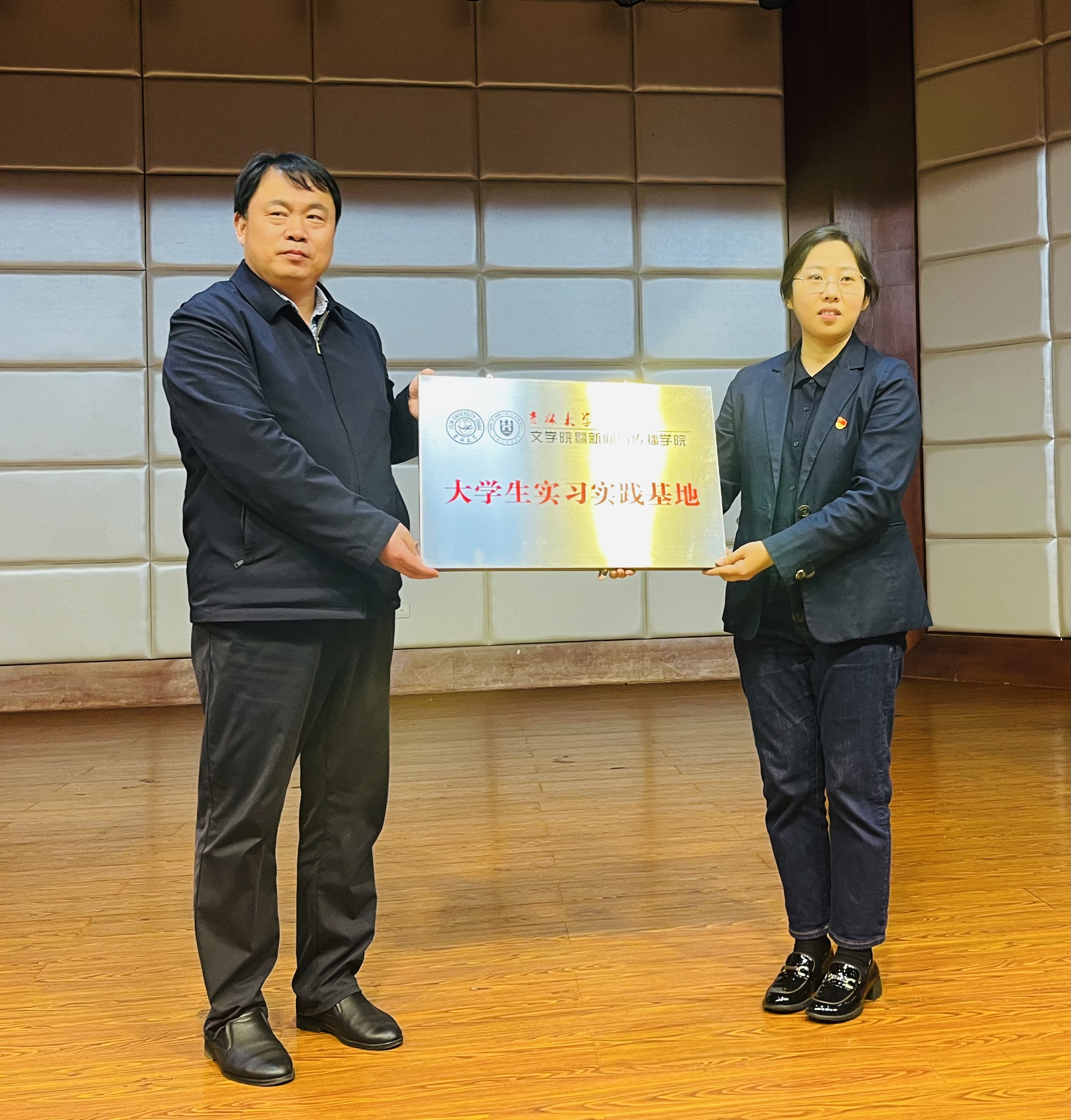 杨一博副书记向鹿邑县高级中学校长高光乾授予开云电子(中国)官方网站_开云电子(中国)官方网站暨新闻与传播学院实习实践基地牌匾。