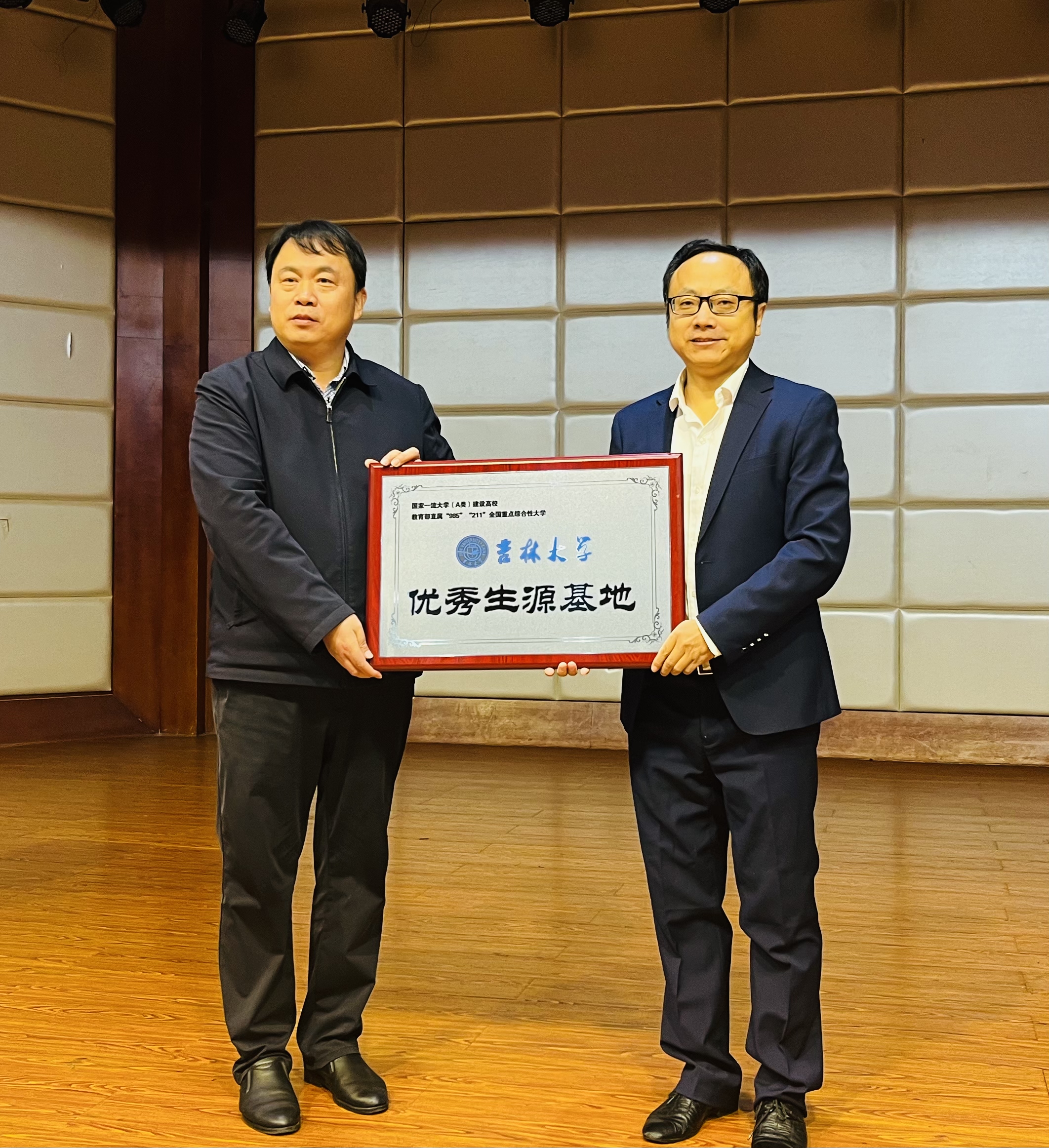 马卫东副院长向鹿邑县高级中学校长高光乾授予吉林大学优秀生源基地牌匾。