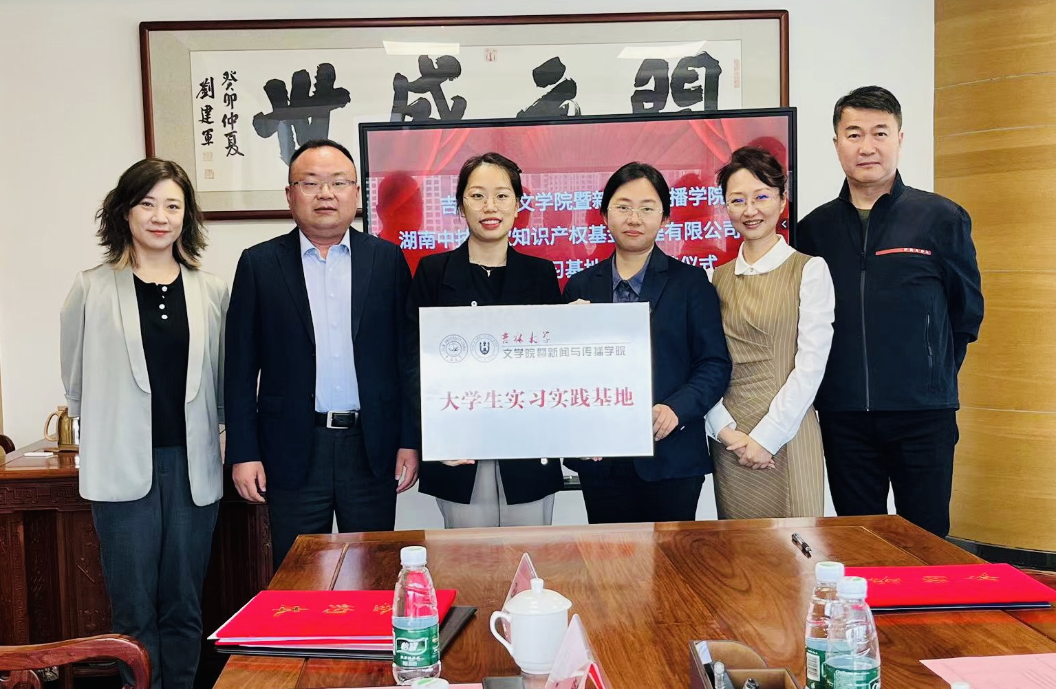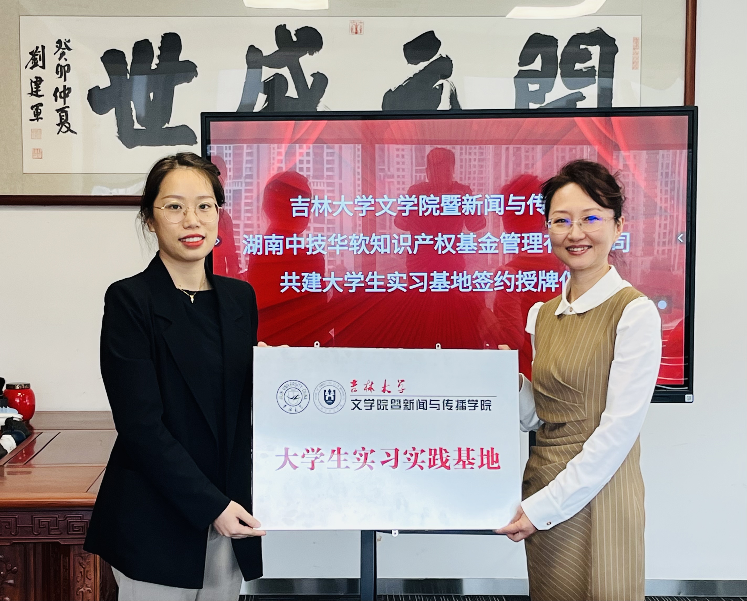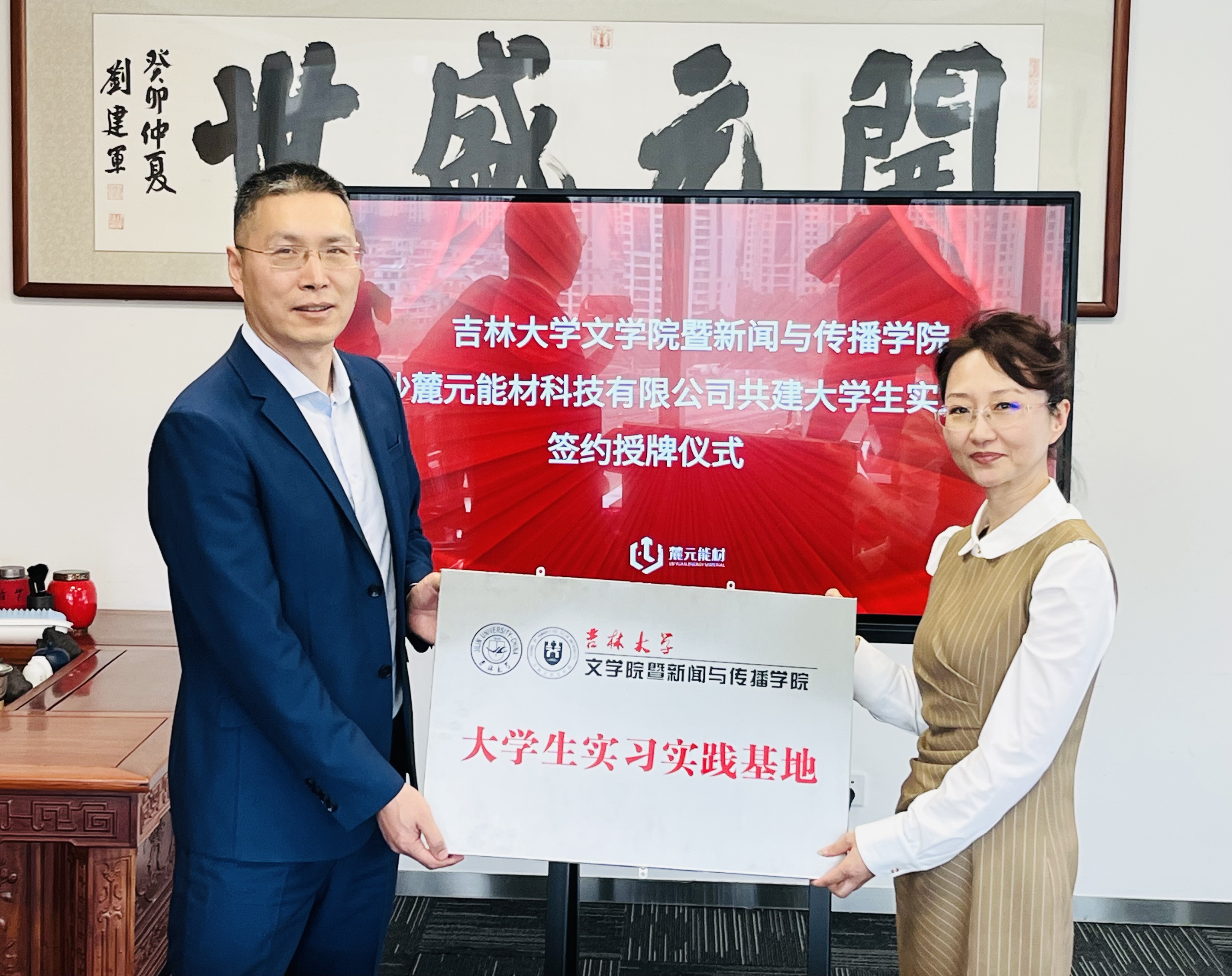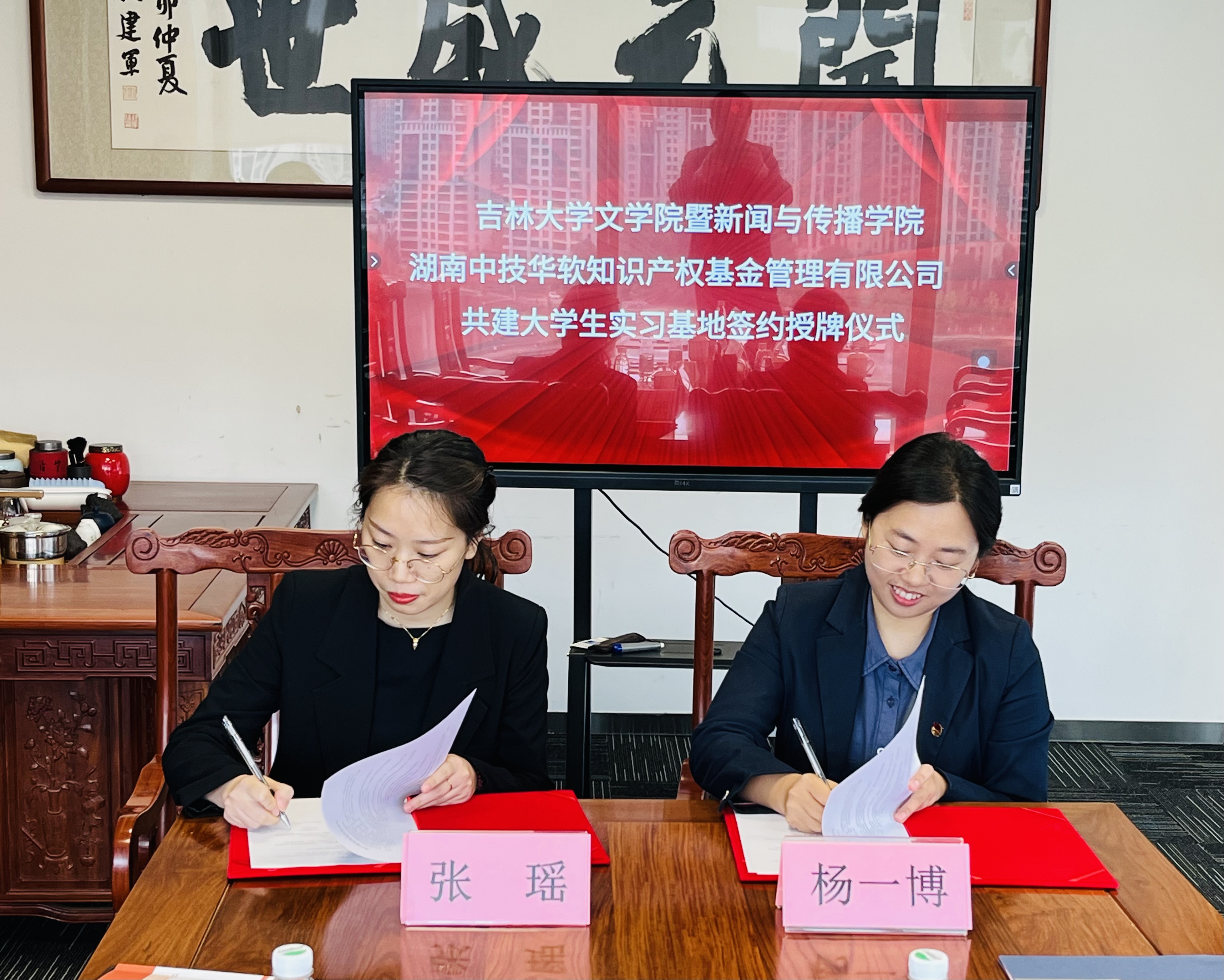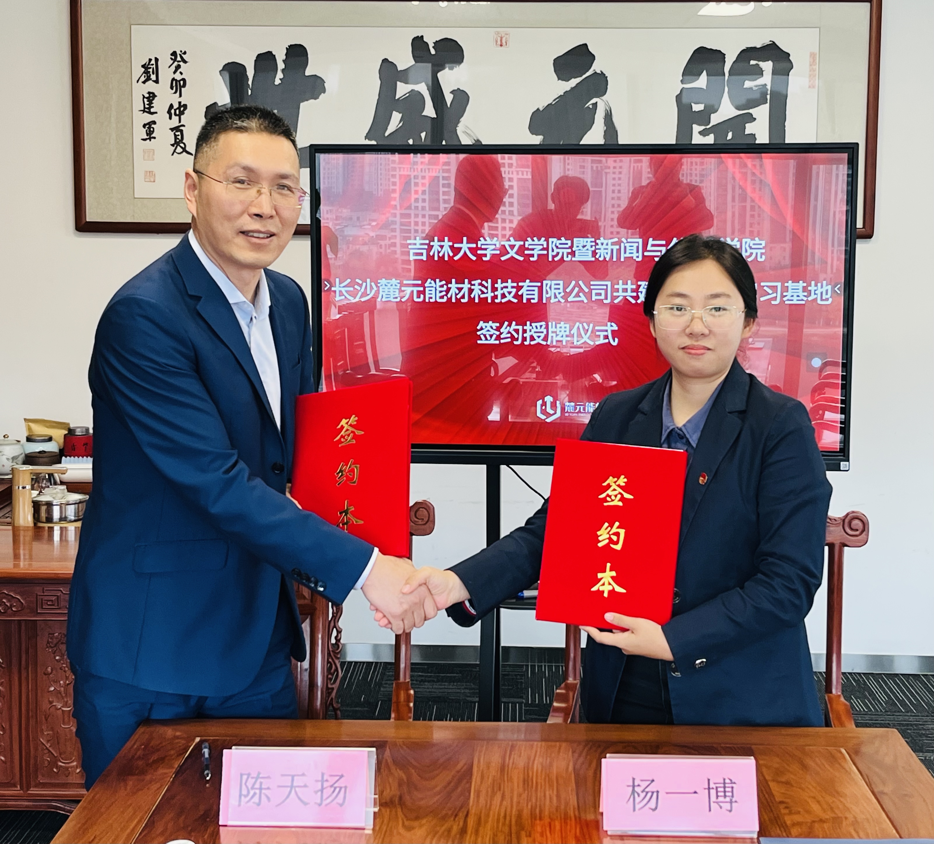 座谈交流后,杨一博代表我院正式与长沙麓元能材科技有限公司、湖南中技华软知识产权基金管理有限公司签订大学生实习实践基地并举行授牌仪式。