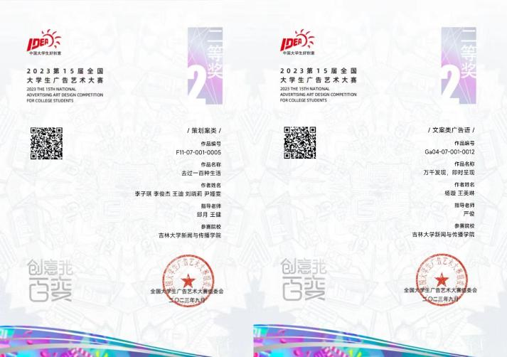 在师生的积极参与和共同努力下,我校作品在一众参赛作品中成功脱颖而出,取得优异成绩,开云电子(中国)官方网站_开云电子(中国)官方网站暨新闻与传播学院共获得国家二等奖2项,分别为由邱月、王健老师共同指导,学生李子琪、李俊杰、王迪、刘晓莉、尹娅雯共同完成的策划案作品《去过一百种生活》,以及由严俊老师指导,学生杨璇、王美琳共同完成的广告文案作品《万千发现,即时呈现》。另获得国家三等奖3项,国家优秀奖10项。