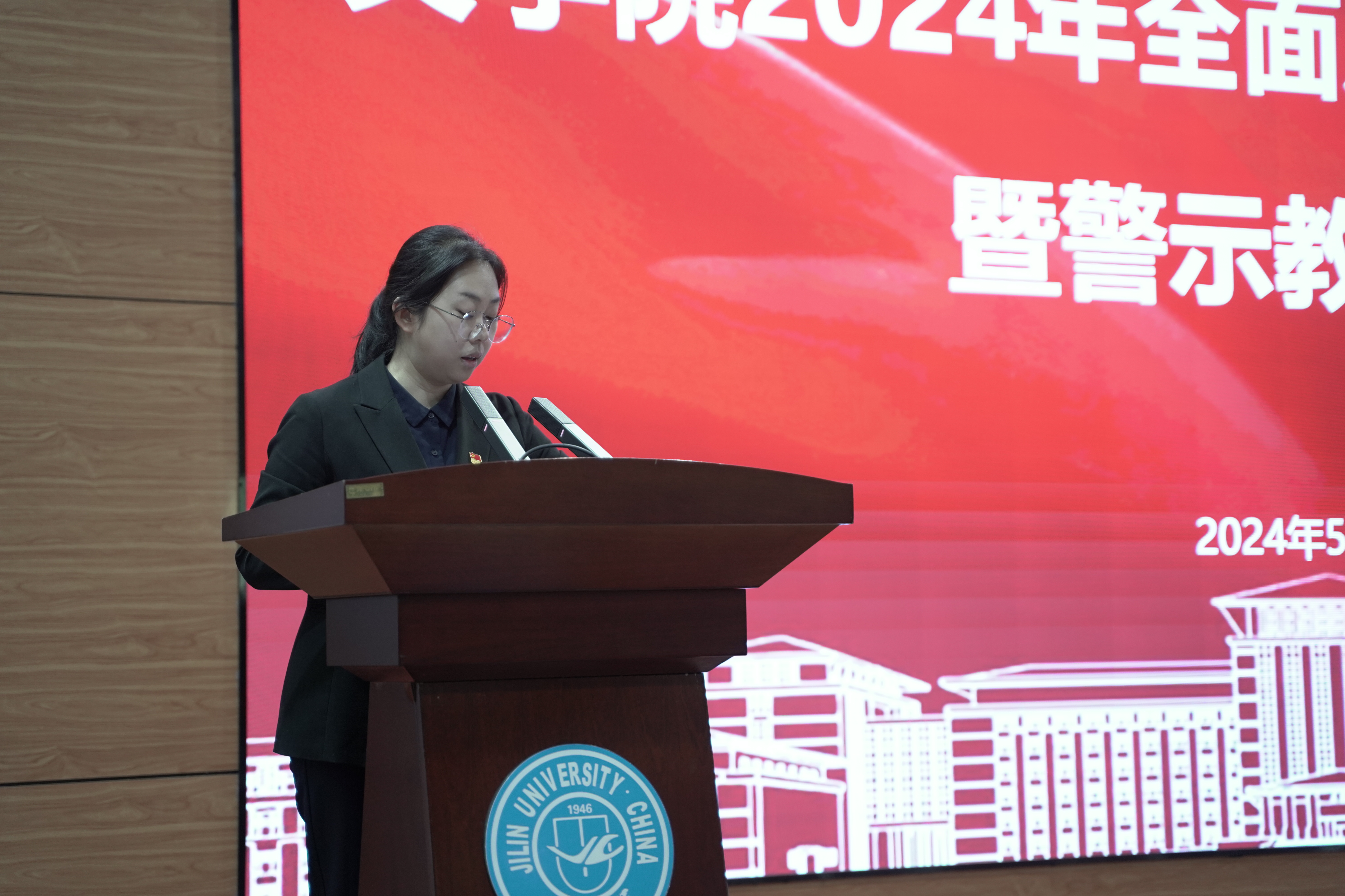 会上,学院党委副书记兼纪委书记刘卓同志通报了学校2023年以来的违法违纪违规典型案例,学院党委副书记杨一博同志向全体教职工传达了吉林大学2024年全面从严治党工作会议暨警示教育大会精神,学院副院长刘艳同志通报了学院2023年财务决算。