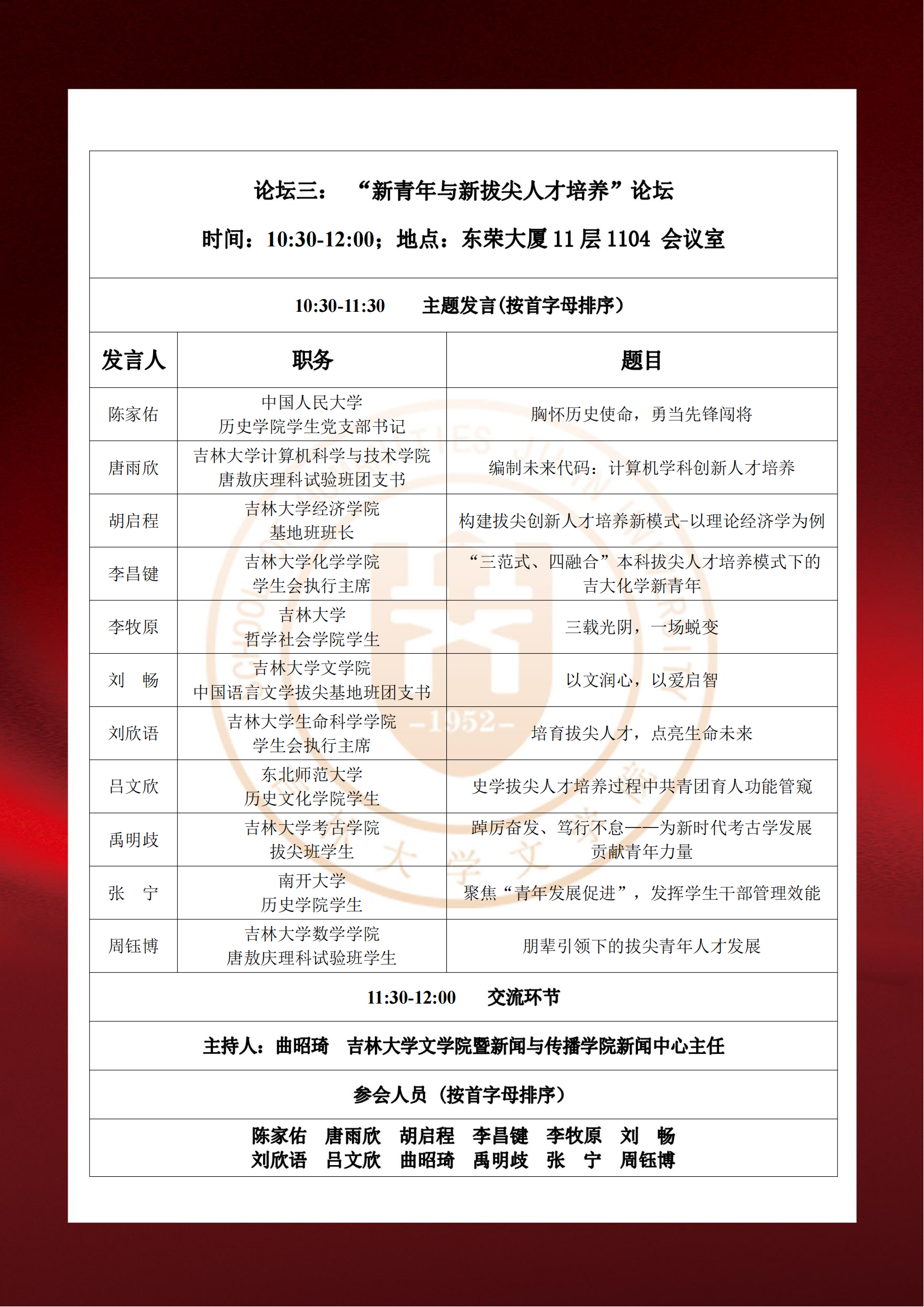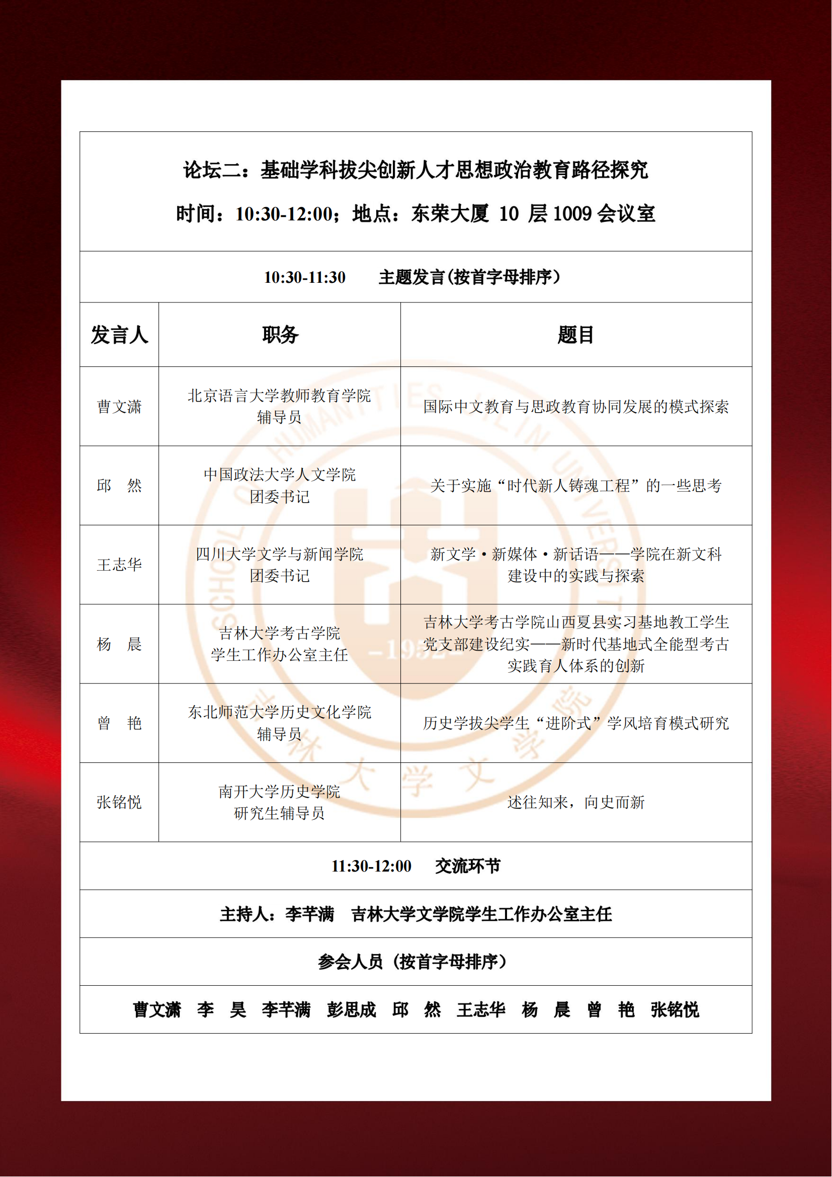 本次联学论坛围绕“党建引领拔尖开云电子(中国)官方网站_开云电子(中国)官方网站”“基础学科拔尖创新人才思想政治教育路径探究”“新青年与新拔尖开云电子(中国)官方网站_开云电子(中国)官方网站”等主题设有三个分论坛。