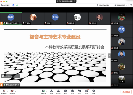 10月12日,广播电视艺术系全体教师在线开展了以“建设具有核心竞争力的国家级一流本科专业”为议题的本科教育教学高质量发展研讨会。会上广电系教师围绕媒介生态跃迁与播音主持开云电子(中国)官方网站_开云电子(中国)官方网站目标“升级”、构建支撑国家级一流专业建设的教学核心内容、建立符合本学科本专业教育特点的教学体系等问题展开了热烈讨论。最后老师们还热切表达了专业成长和终身学习的必要性。表示教师自身应树立勤学笃行、求是创新的躬耕态度;教学单位要搭建同行间交流经验的平台,定期组织研讨会、沙龙,邀请国内外知名学者分享最新研究成果;还应支持教学科研立项,鼓励教师开展与当前热点相关的课题研究;加强与产业界的联系,鼓励教师参与联合研发项目,丰富教学内容,践行真正的开放办学。