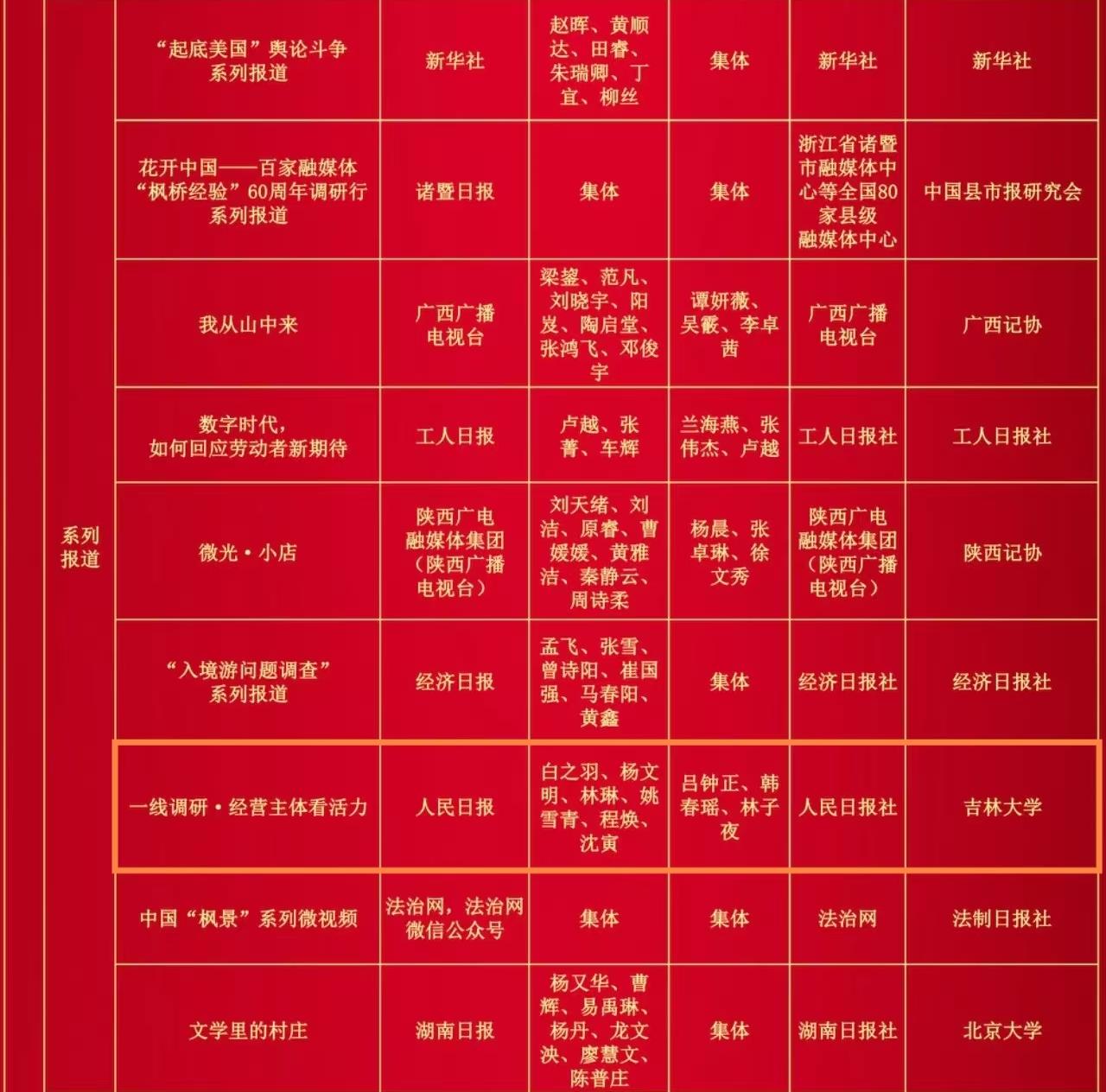 本网消息 11月7日,第34届中国新闻奖评选结果揭晓,吉林大学新闻与传播学院报送的2件作品:央广网的舆论监督报道《六问:河南南阳收割机为何无法下高速?》(作者:汪宁、余京津、刘保奇,编辑:张军、于锋、王薇)、人民日报的系列报道《一线调研·经营主体看活力》(作者:白之羽、杨文明、林琳、姚雪青、程焕、沈寅,编辑:吕钟正、韩春瑶、林子夜)双双获得第34届中国新闻奖二等奖。该院自2016年成为中国新闻奖试点报送单位以来,至今已有6件初评报送作品获得中国新闻奖。