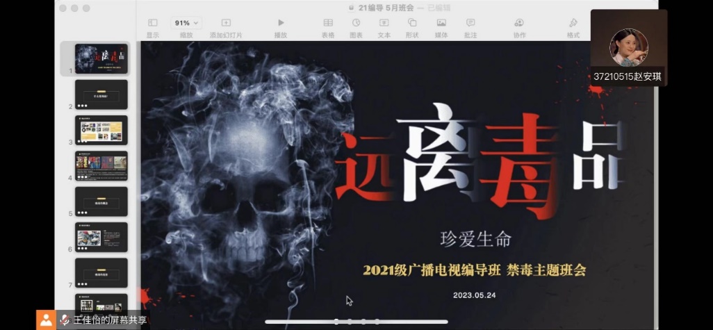 2023年5月24日星期三傍晚七点半,2021级开云电子(中国)官方网站_开云电子(中国)官方网站暨新闻与传播学院广播电视编导班级在班主任王佳怡的组织下,于腾讯会议开展了以禁毒宣传教育为主题的线上班会。作为生活在象牙塔中的大学生,毒品离我们看似很遥远,实际上却始终在潜伏在身边的阴影中。会议伊始,王佳怡老师便点明了远离毒品的主题,并郑重地告诉大家,无论何时何地,绝不能跨雷池一步。为了让我们更清晰地了解毒品有关知识,从而更好远离,老师从什么是毒品、吸毒的概念、吸毒的危害等方面多角度进行了讲解。同学们也在听完后纷纷表示,要对自己的人身健康和安全负责,不会触碰法律的红线。祖国的未来不应也不能被毒品侵害,愿我们都能坚守底线、行稳致远。