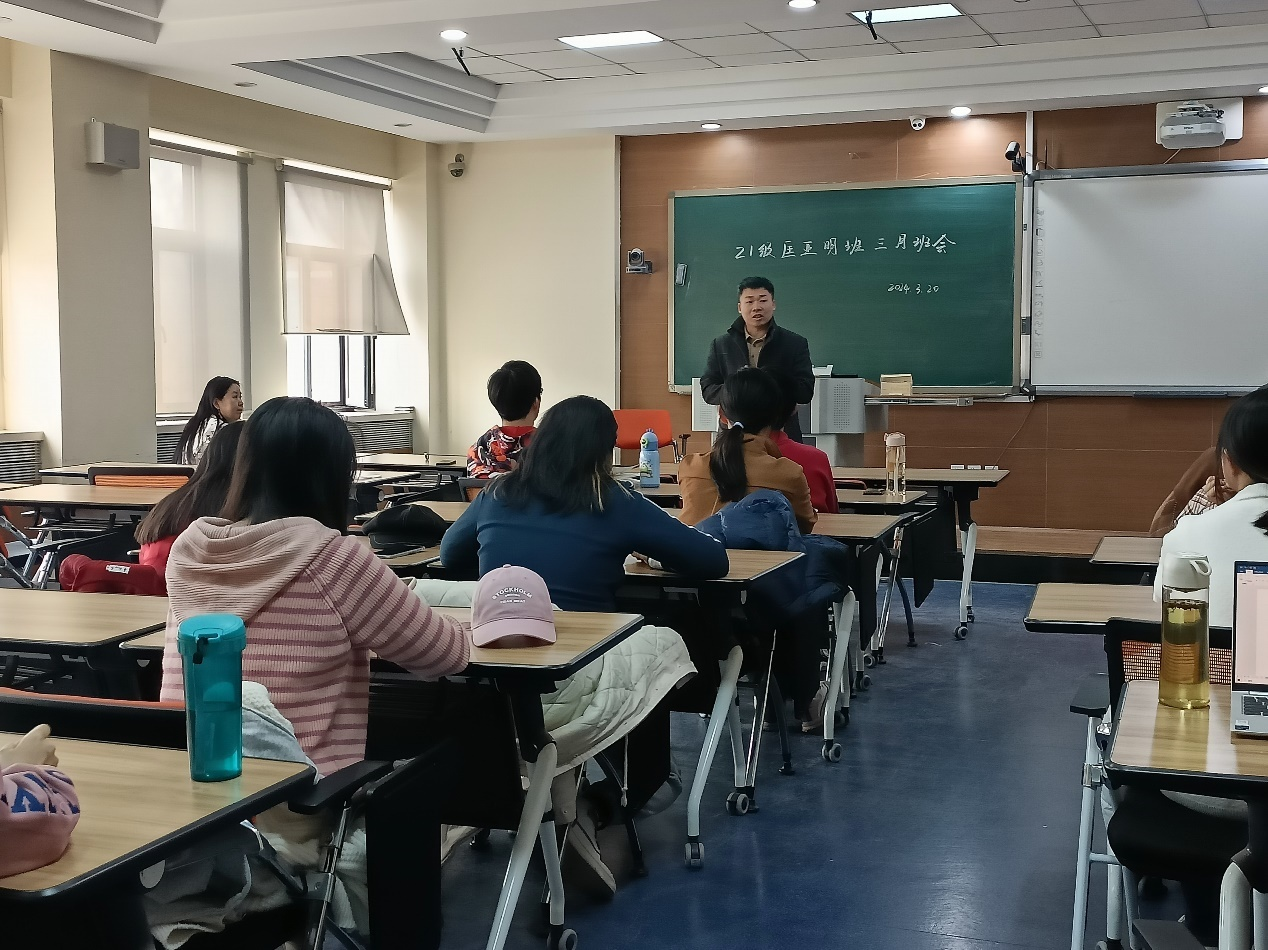 3月20日下午,2021级人文科学试验班于敬信教学楼召开了三月份班会,参会人员有班主任徐萍老师、孟凡君老师以及2021级人文科学试验班全体同学,班会全程由班长林雨馨主持。本次班会主要围绕未来升学及个人发展为主题开展。首先进行讲话的是孟凡君老师,孟老师的发言主要针对读研的三个方面进行展开。第一是关于读研价意义的分析。孟老师指出,在目前的大环境下,选择进行研究生阶段的学习会使同学们未来的择业选择更加丰富,起点变得更高。第二是关于研究生考试的备考,孟凡君老师强调了学习的阶段式规划,关于备考期间不同时间段的不同侧重。此外,高强度的学习战线不应拉得过长,否则难以保持学习热情和专注力。第三是关于考研或保研面试时应加以关注的问题,孟老师提醒同学们要加强对专业度的重视,同时回答问题要注意层次性和清晰度,有针对性地条分缕析、直击要点。此外,孟凡君老师也对同学们做出提醒:研究生学习只是一个阶段,而非目的。考研不等于就业,同学们的目光要放得长远,把握好自己人生的大方向。随后,徐萍老师则根据自己参与的一场口述史采访将个人感触与同学们分享。徐萍老师讲述了中国汽车空调第一人勇于创新的艰苦创业事迹,呼吁同学们学习其优良品质及崇高精神,同时也提醒同学们:人生需要挑战,要敢于尝试新领域。要始终保持对世界的好奇心,好奇心是创新的驱动力,也是我们探索世界的原动力。班长林雨馨提醒班级同学要关注个人身心健康发展,生活和学习中有任何困惑可以选择预约后到学校心理咨询室进行心理咨询,或联系辅导员老师,解决自己的困扰。至此,本次班会圆满结束。相信老师们的建议一定可以帮助同学们以全新的视角和审慎的态度对待今后的学习和生活,并且认真考虑自己的个人目标设定,以长远眼光和理性思维规划自己未来的人生方向。