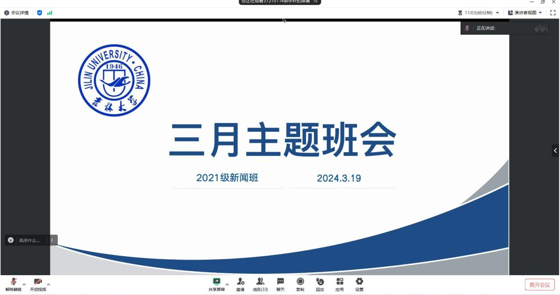 3月19日,2021级新闻学专业3月班会通过腾讯会议圆满召开,班主任张斯琦老师和全体同学准时入会。本次班会以“新学期,新发展,新精神”为主题,旨在引导同学们明确个人发展目标,深入学习两会精神,为新学期的学习生活注入新的动力。首先,班长郭宇轩同学向大家强调了大三学年的重要性。这是充满挑战和机遇的一年。班长鼓励大家提前着手准备未来的学业规划,希望大家明确自己的目标和方向。建议关注辅导员杨佳欣老师和学校就业中心发布的招聘信息,主动打破信息差,丰富履历,打好基础。对于有意向升学的同学,希望大家保持积极平和的心态,专注自我,提升能力。第二个环节,张斯琦老师详细解读了今年两会政府工作报告的主要内容和精神实质,强调了两会精神对于我们学习和生活的指导意义。同时,她还结合新闻系专业特点,引导同学们关注时事政治,培养敏锐的新闻嗅觉和社会责任感。同学们就此展开了热烈讨论,大家纷纷表示,通过本次班会不仅明确了自己的发展目标,还深刻领悟到了两会精神的内涵和价值。在今后的学习生活中,将以更加饱满的热情和坚定的信念,努力践行两会精神,为实现个人价值和社会进步贡献力量。最后,班长对本次班会进行了总结,她提出希望同学们能够以此次班会为契机,珍惜大学时光,努力学习专业知识,积极参与各类实践活动,不断提升自己的综合素质和竞争力,不断完善自己的个人发展规划,同时深入学习两会精神,将个人理想融入国家和民族的伟大事业中。本次班会不仅为同学们提供了一个交流学习的平台,也让大家在新学期伊始明确了发展目标和方向。相信在未来的日子里,新闻系的同学们一定会以更加昂扬的斗志和扎实的学识,书写属于自己的精彩篇章!