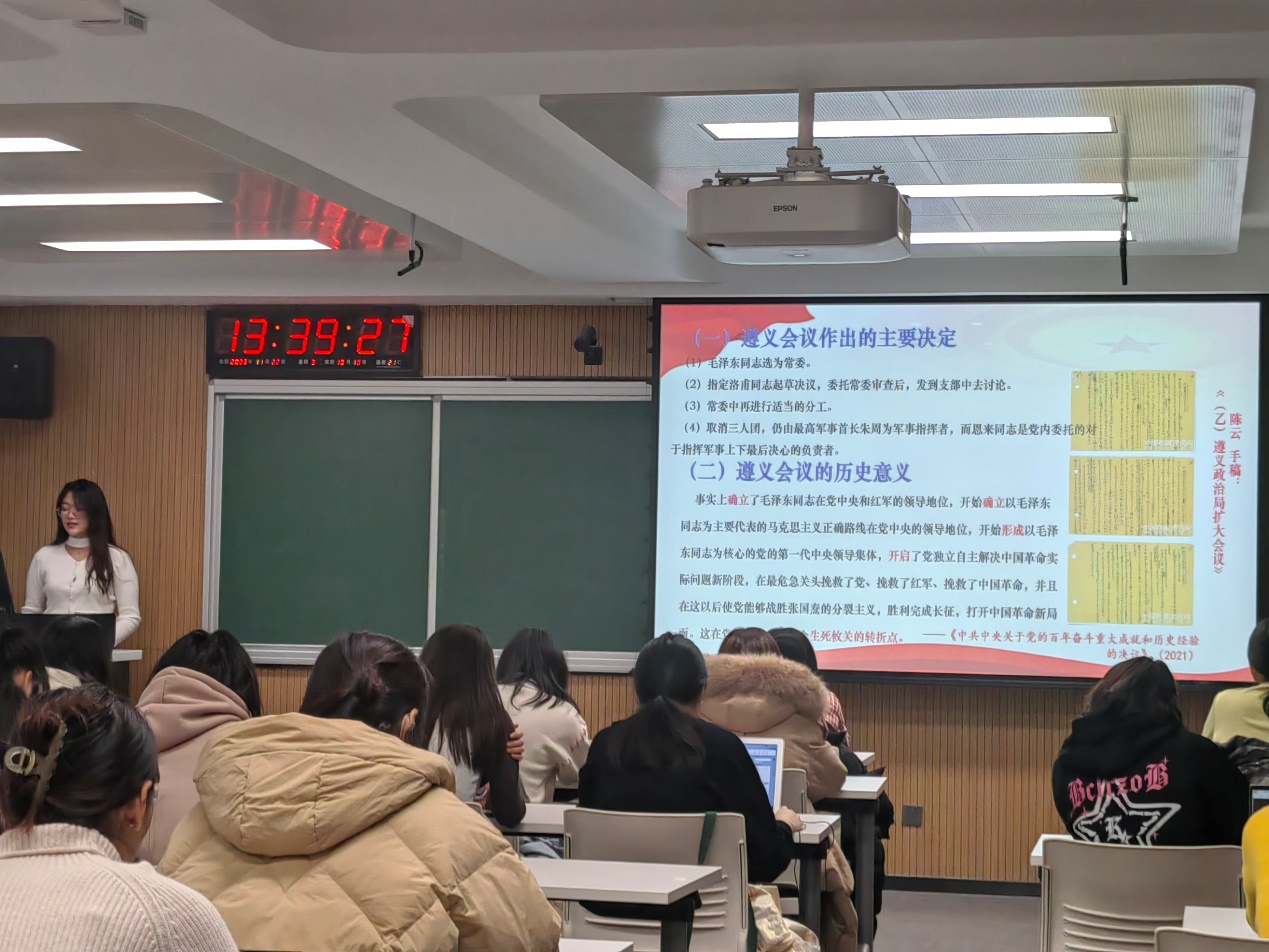 团队在10月22日、11月17日、11月22日(进行两场宣讲)、11月23日(进行两场宣讲)、11月24日(进行两场宣讲)、11月25日、12月2日共进行了十场宣讲。依托学院主题党日活动、团日活动、班会,宣讲团队精心呈现了每一场宣讲内容,十场宣讲内容丰富,包含了对贵州遵义的介绍、遵义会议的具体内容以及遵义会议的历史作用和重要性。同时,为了能够丰富宣讲内容,遵义会议精神文传宣讲团还以情景演绎的方式讲述了很多遵义会议时期的小故事。同学们全神贯注与宣讲员共同了解遵义会议精神及其背后的内涵,红色之种深植于同学心中,促使文化育人与实践育人发挥着更强实效。