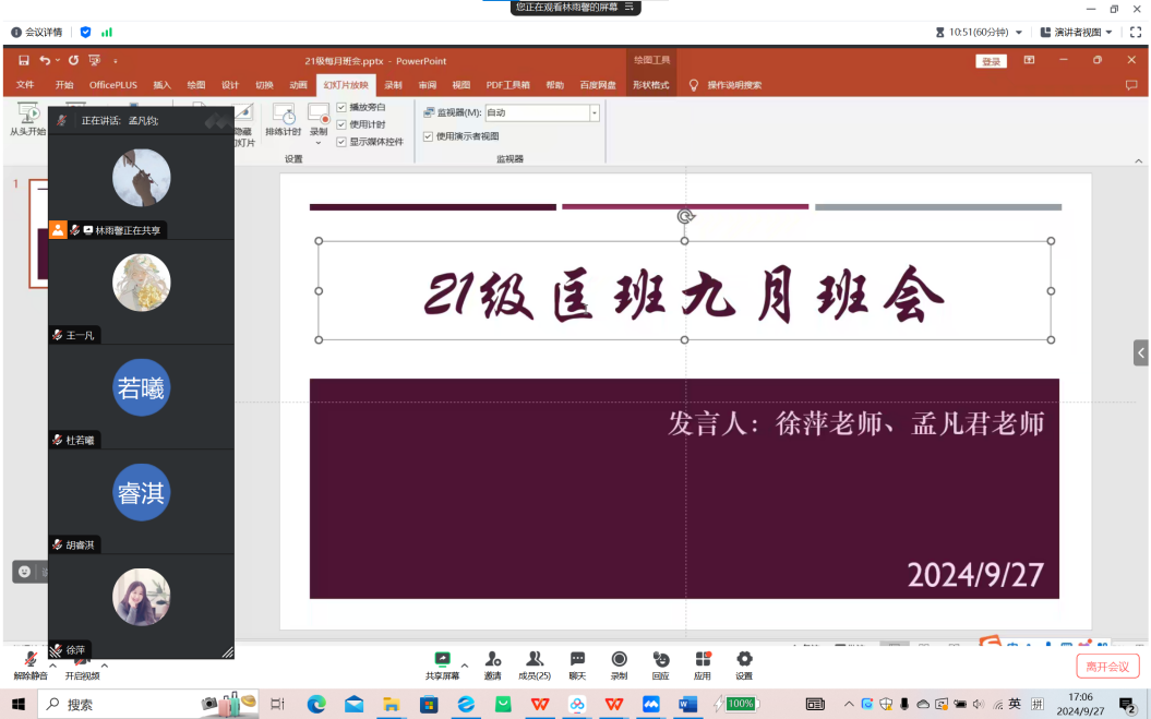 9月28日下午14时,2021级汉语言文学班级于线上召开了9月份班会活动,由张一帆老师与王姝老师共同主持。会议伊始,张一帆老师首先指出,推免虽然已经接近尾声,但仍要保持积极的心态,应对接下来的学习生活。此外,张老师还特别提醒大家,入秋天气渐凉,注意保暖,防止感冒等季节性疾病的发生。随后,王姝老师勉励同学们面对考研和就业时要做到稳步向前、尽力而为。通过这次班会,同学们不仅获得了实用的推免、考研及就业的相关建议,也收获了关怀与温暖。
