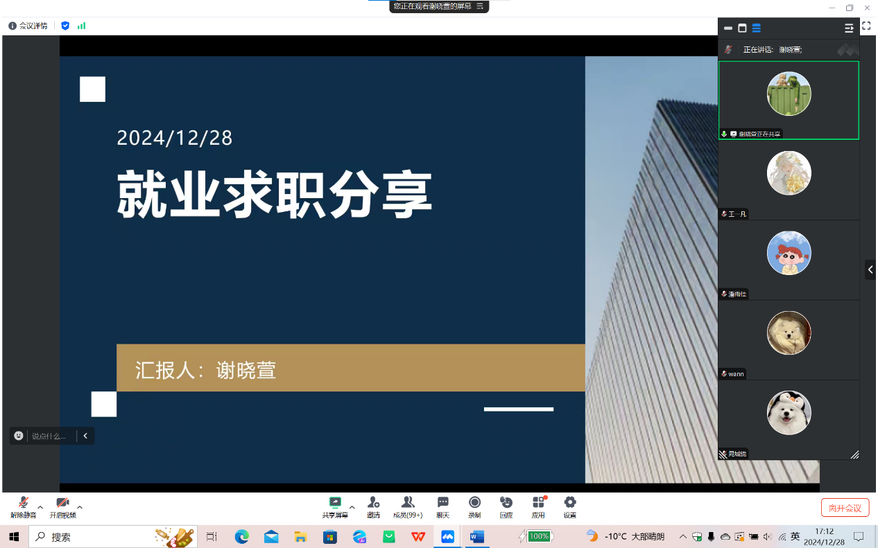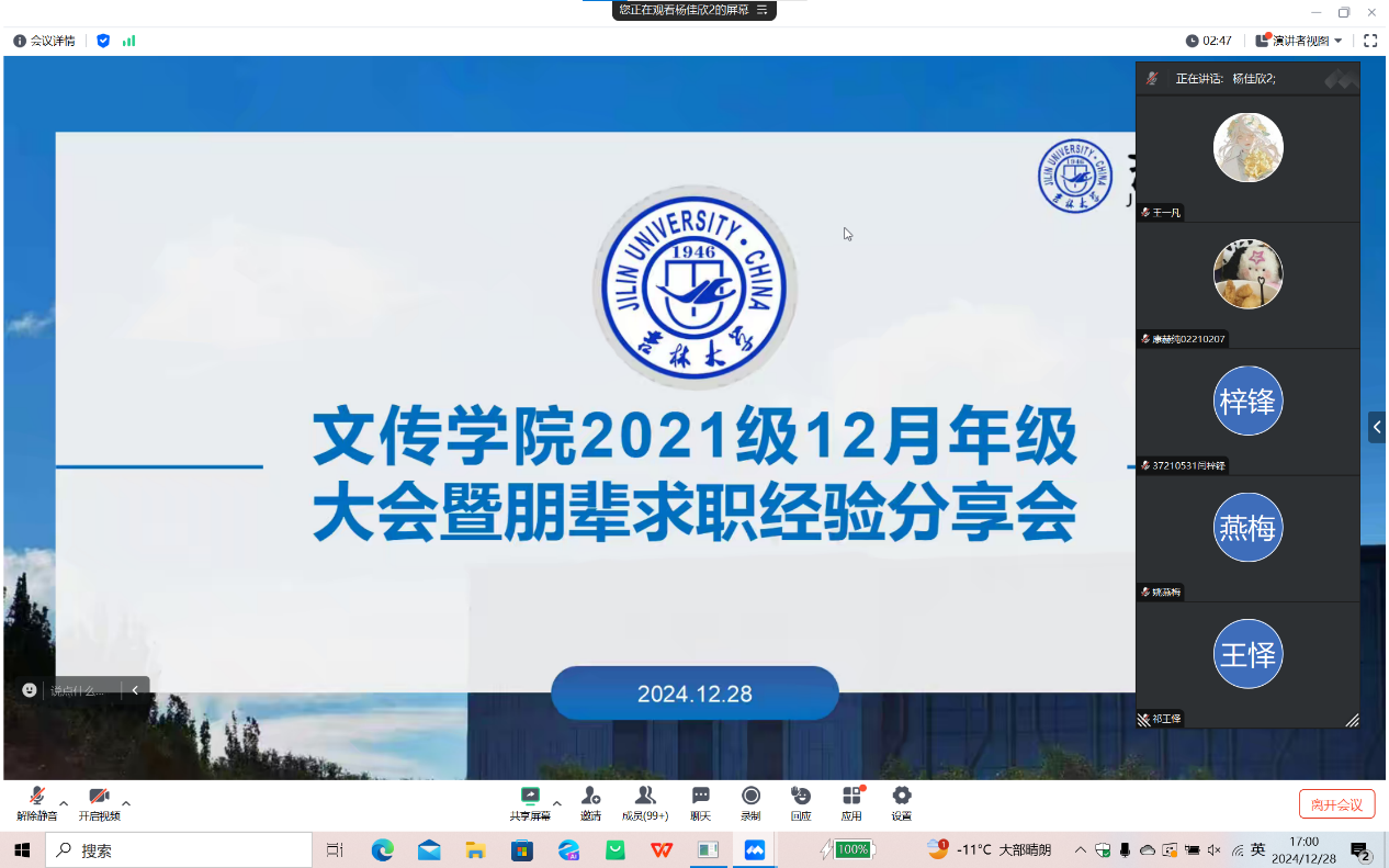 2024年12月28日下午五时,开云电子(中国)官方网站_开云电子(中国)官方网站暨新闻与传播学院在寒假前夕以线上形式召开了年级大会暨朋辈就业经验分享会,会议由辅导员杨佳欣老师主持,全体大四学生参加了此次大会。会议内容涵盖了毕业论文、文明离校、假期规划以及求职经验分享四个方面,为同学们即将到来的寒假生活和未来职业规划提供了宝贵的指导和建议。