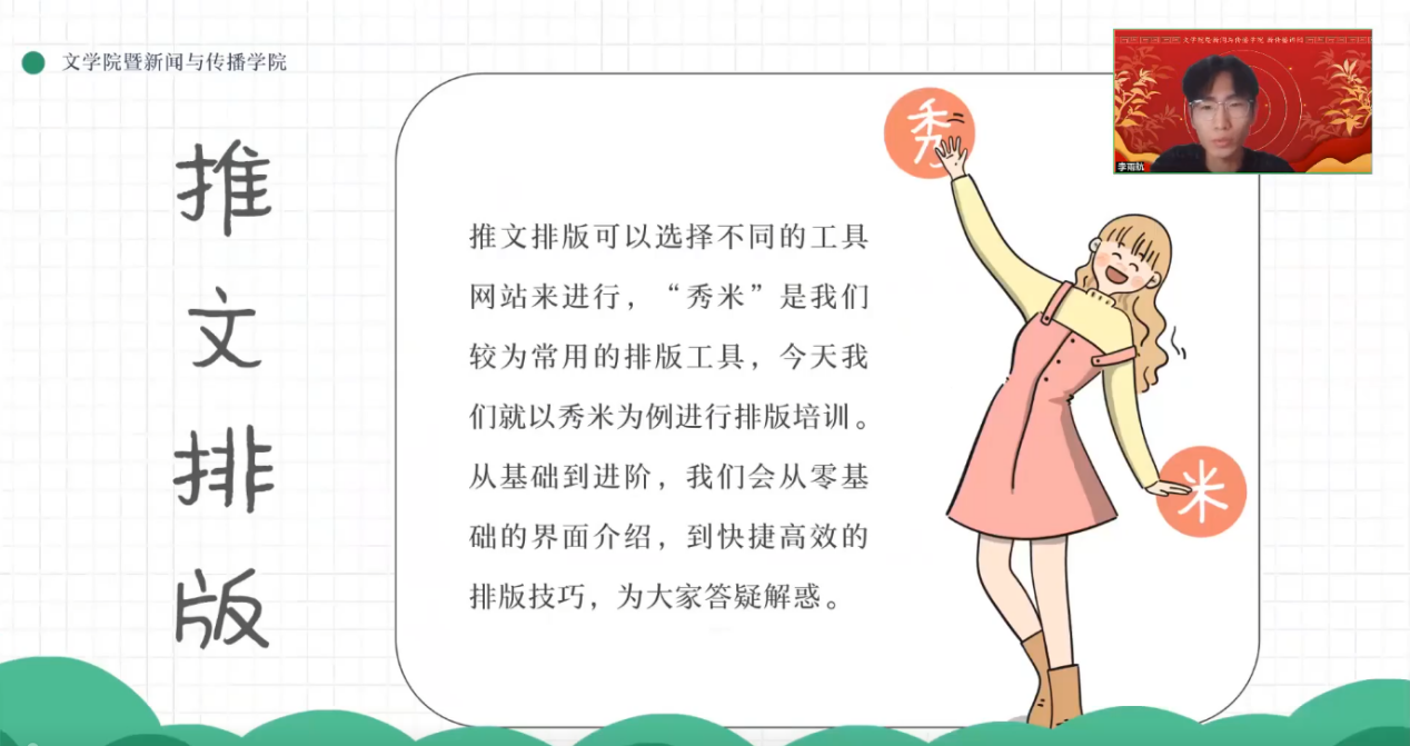 本次“讲团小春晚”立足学科特色,针对学生校园媒体工作中的常见“痛点”,精心设计八大主题课程。首场“秀米排版培训”以学院公众号推文为案例,拆解排版逻辑与视觉设计技巧;“会议摄影培训”和“风光摄影培训”,分别结合摄影技巧和构图知识进行了深入讲解;“新闻报道培训”课程结合具体案例,展示新闻报道中的要点,强化学生信息整合与深度叙事能力。此外,“数据分析培训”聚焦新媒体应用中的数据分析与可视化,强调了Excel等工具在数据处理中的应用,“人物采访培训”传授访谈提纲设计与沟通技巧,“公文写作培训”解释了不同文体之间的区别与要求,介绍了报告、会议纪要和会议记录的写作方法。“选题创意培训”则从账号定位、受众、标题等方面分享了公众号内容制作的经验和创意选题的方法。