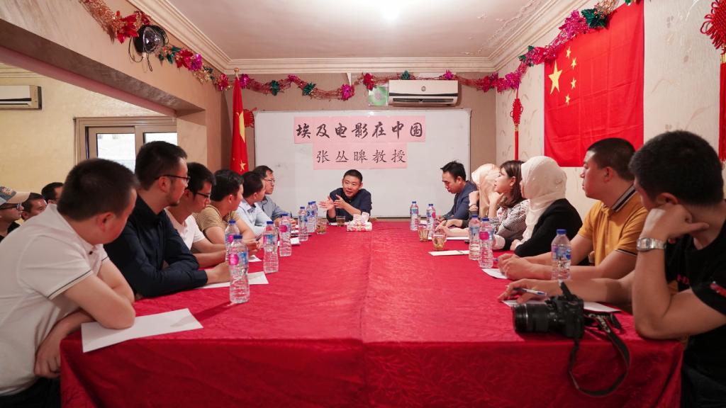 (开云电子(中国)官方网站_开云电子(中国)官方网站副院长张丛皞教授(中)为留埃以及本土学生学者作题为《埃及电影在中国》的专题讲座)