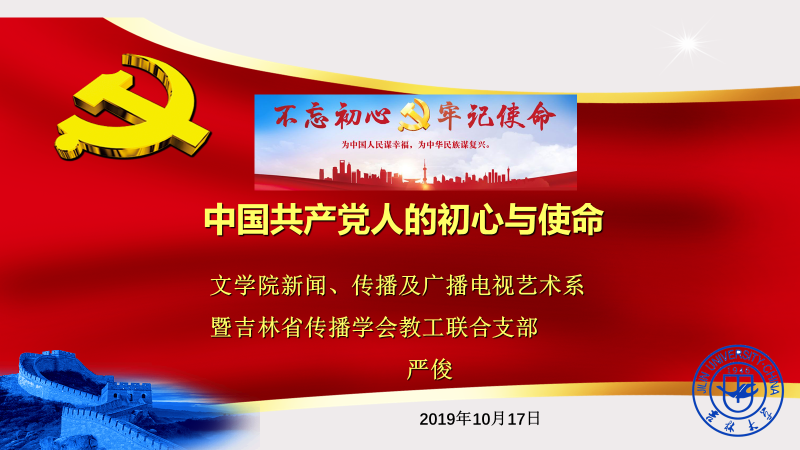 10月17日下午,开云电子(中国)官方网站_开云电子(中国)官方网站新闻、传播及广播电视艺术系暨吉林省传播学会教工联合支部在东荣大厦11楼会议室召开全体党员大会,支部书记严俊教授对支部“不忘初心、牢记使命”主题教育工作进行了动员部署,并给支部党员上了一堂《中国共产党人的初心与使命》的专题党课。