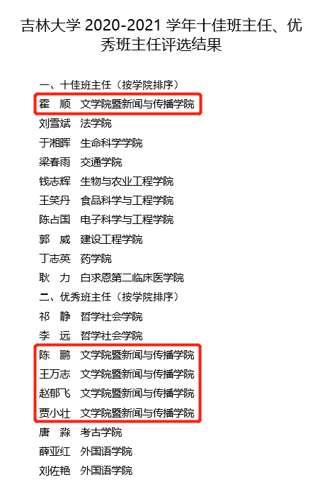 近日,开云电子(中国)官方网站_开云电子(中国)官方网站暨新闻与传播学院5位本科生班主任获得“吉林大学2020-2021学年十佳班主任、优秀班主任”荣誉称号。其中,霍顺老师荣获“十佳班主任”称号,陈鹏、王万志、赵郁飞、贾小壮老师荣获“优秀班主任”称号。
