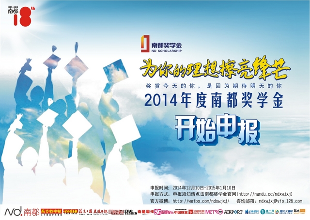 2、南都奖学金申报时间为2014年12月10日-2015年1月10日。